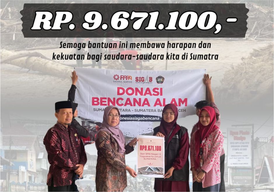 SMAN 5 YOGYAKARTA SALURKAN DONASI BENCANA MELALUI DARUL QUR’AN Dalam rangka menunjukkan kepedulian sosial dan semangat kemanusiaan, SMA Negeri 5 Yogyakarta kembali melakukan aksi solidaritas dengan menyalurkan bantuan donasi bagi korban musibah bencana alam. Bantuan