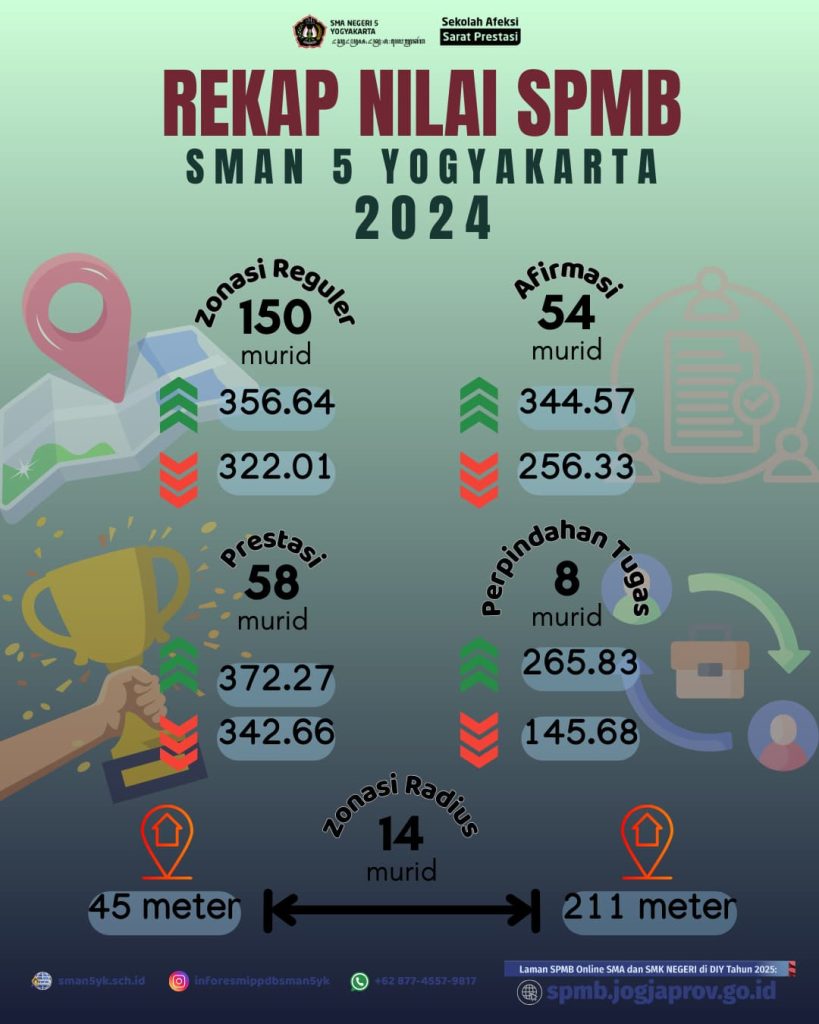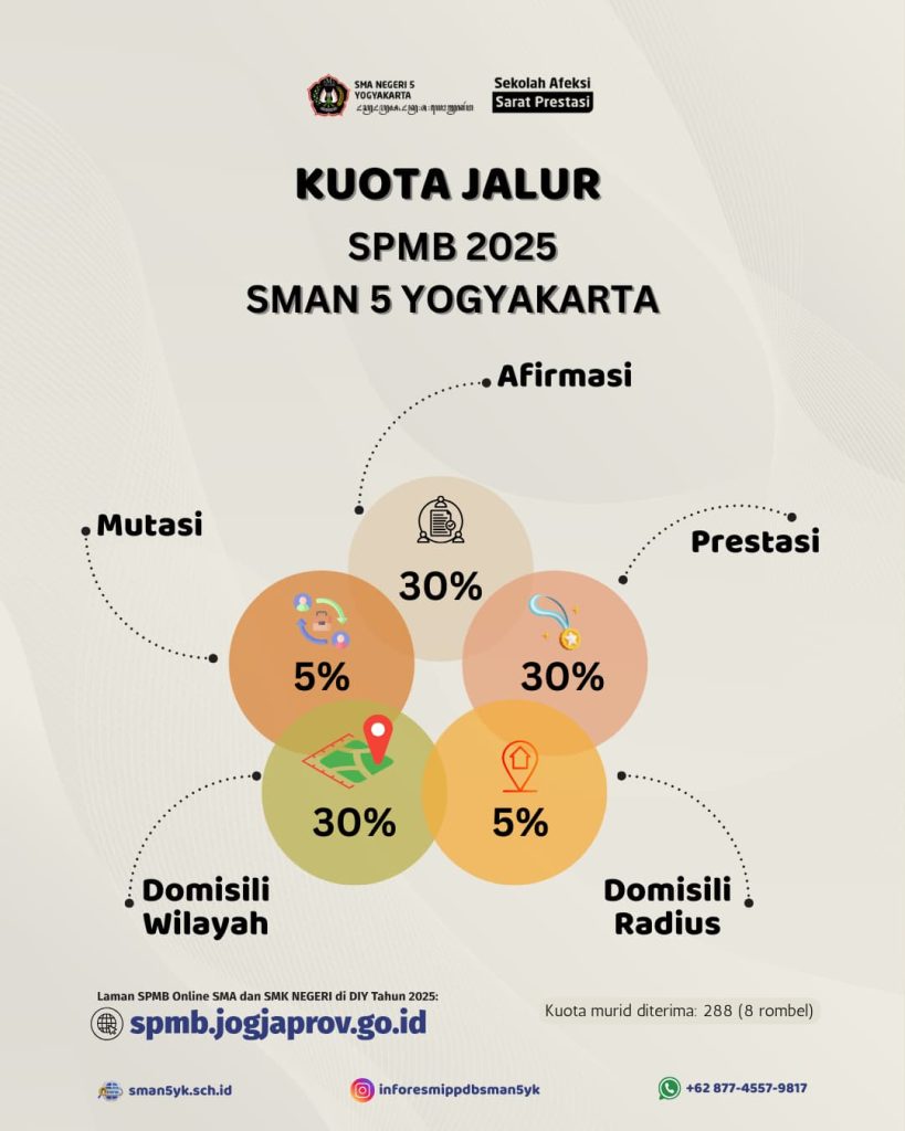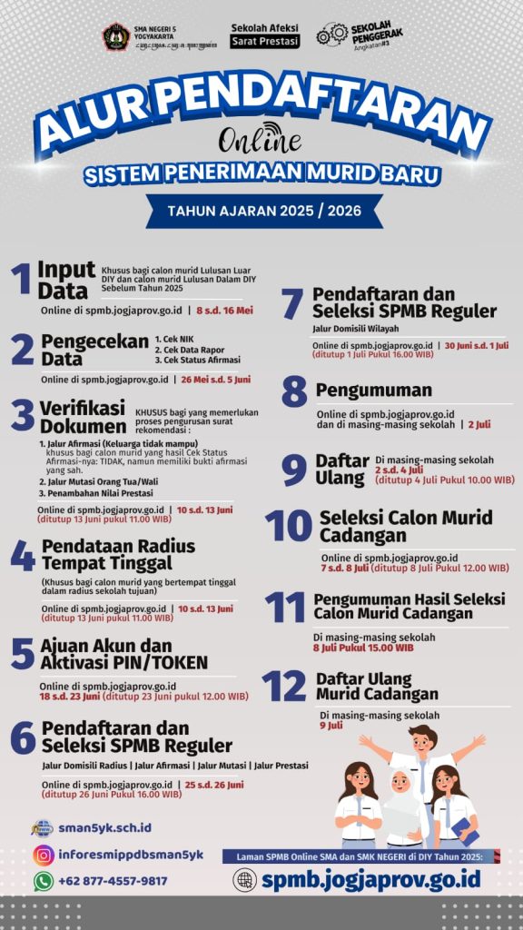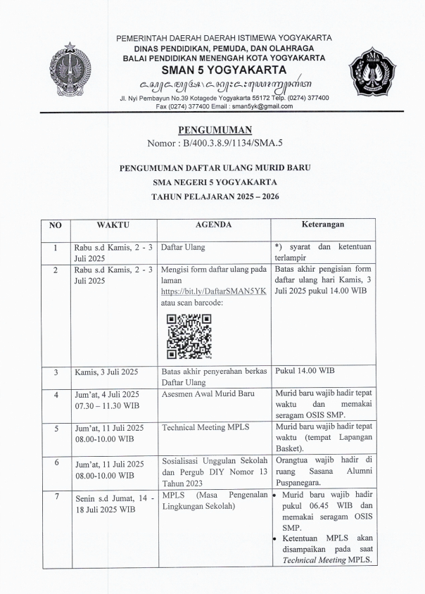 Syarat berkas Daftar Ulang SMA Negeri 5 Yogyakarta adalah sebagai berikut: 1. Bukti atau Cetak Pendaftaran Online 2. Fotokopi Rapor SMP/MTs/Paket B/Wustha semester 1-5 3. Fotokopi Ijazah/SKL 4. Fotokopi dua (2) lembar Kartu Keluarga (KK) 5. Fotokopi dua (2) lembar Akta Kelahiran 6. Surat Pernyataan Murid Kelas X Bermaterai dan ditandatangani orangtua (disediakan oleh Sekolah). 7. Apabila sebagaimana nomer 3 belum ada, maka dapat digantikan Surat Pernyataan dari Kepala Sekolah SMP/MTs/Paket B/Wusta yang menyatakan bahwa Ijazah belum terbit dan digantikan dengan Surat Keterangan Pengganti Ijazah. 8. Surat Pernyataan orangtua yang berkaitan dengan KEASLIAN DOKUMEN dan persyaratan lain yang dibutuhkan oleh satuan Pendidikan (disediakan oleh Sekolah). 9. Bagi calon Murid yang memiliki PRESTASI dibidang olahraga, seni, ataupun lomba lainnya Wajib melampirkan Fotokopi Sertifikat Prestasi/Kejuaraan satu (1) lembar. 10. Surat Rekomendasi Keterangan Tidak Mampu (PKH/KMS/KKS/atau berkas pendukung lainnya) Wajib bagi jalur Afirmasi 11. Surat Rekomendasi Mutasi Orang Tua (Wajib bagi jalur Mutasi) 12. Mengisi formulir Daftar Ulang dengan link: https://bit.ly/DaftarSMAN5YK